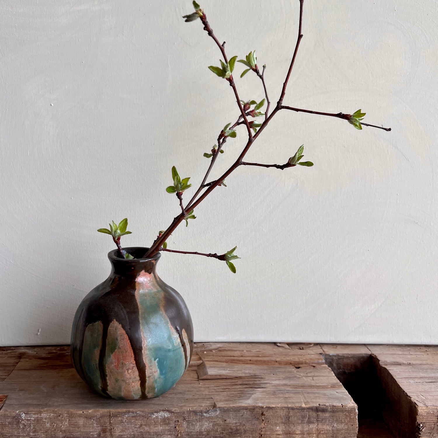 This unique dripped glaze vase is from the 70's and waterproof. For those that like the organic feel but with a pop of colour, this little piece is for you.