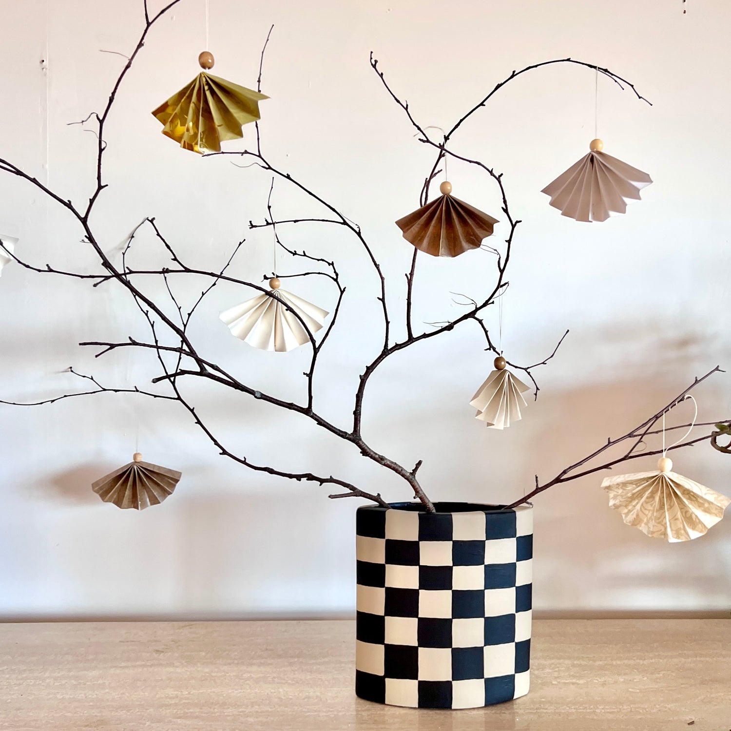 The checkered vases from our Rework Collection are a larger solid clay vase. Fill with branches for an eye catching centrepiece.