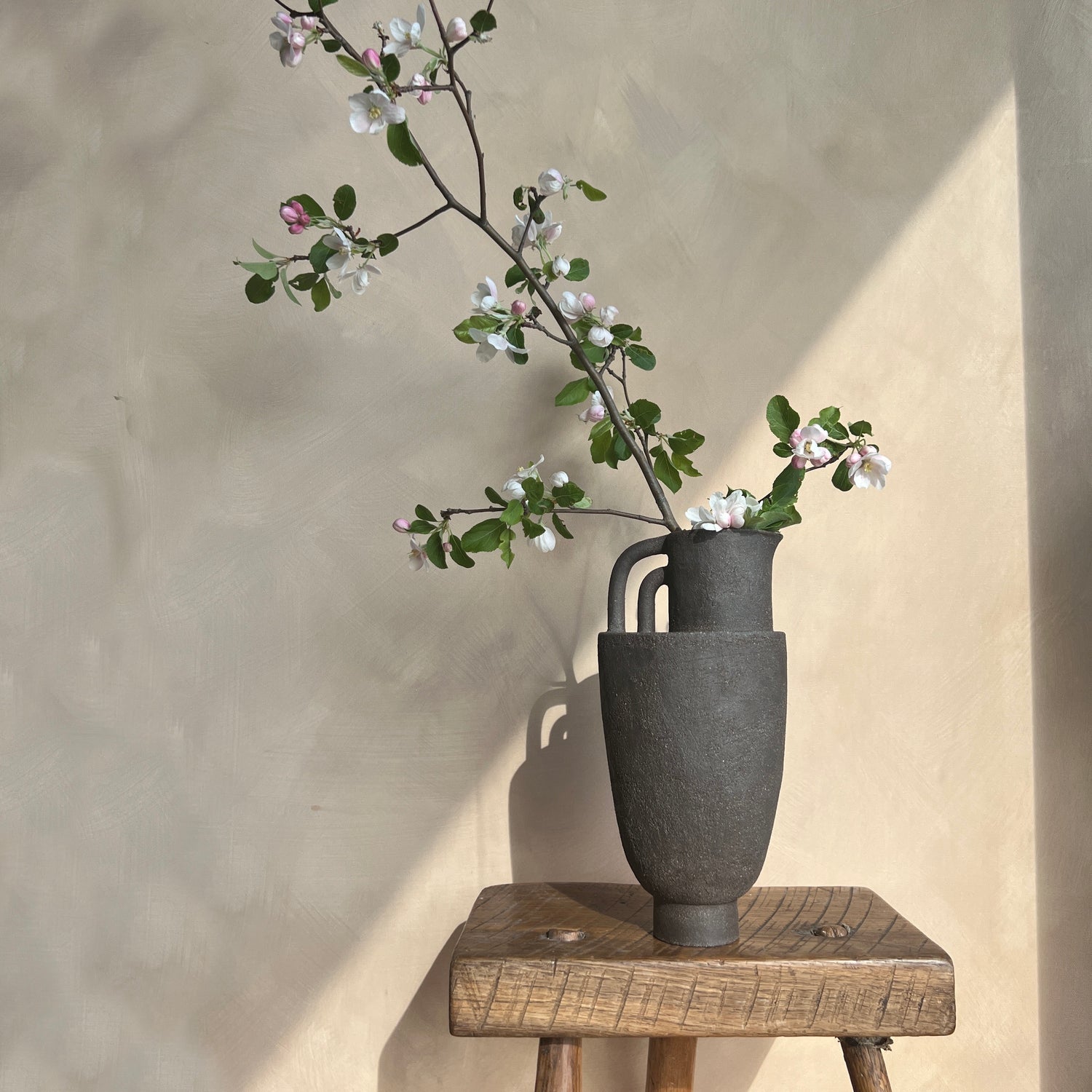 This beautifully textured vase in a warm deep brown colour has a contemporary yet brutalist feel to it. The contrast between the cement like texture and the smooth curves makes this vase a unique and interesting piece.